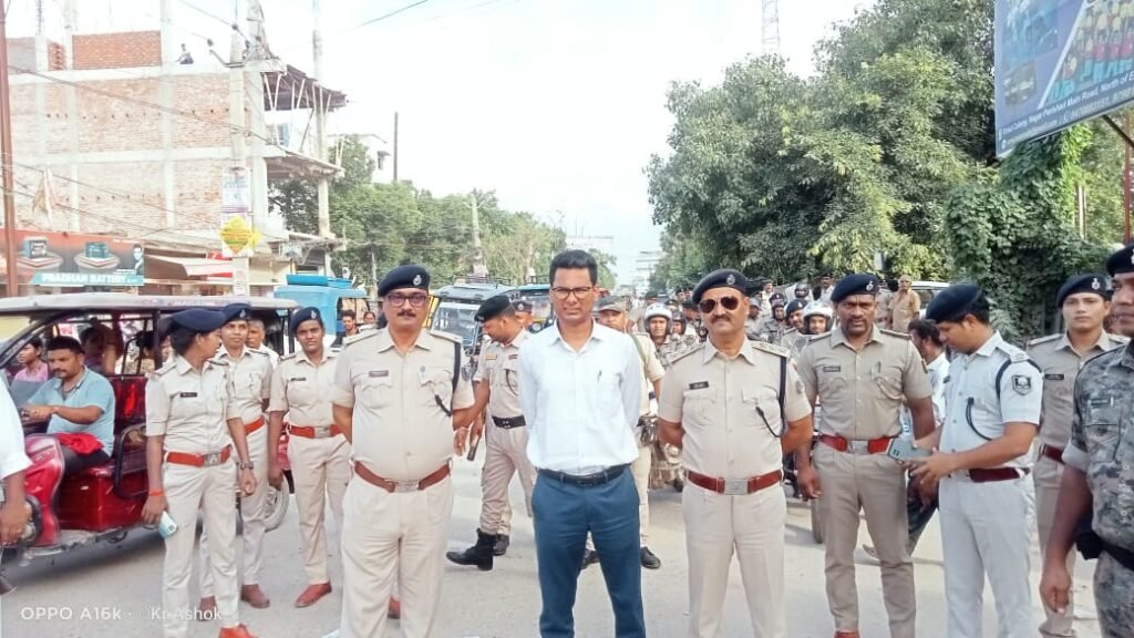 जिला मुख्यालय में आज सदर एसडीओ अश्विनी कुमार और एसडीपीओ राजीव कुमार के नेतृत्व में फ्लैग मार्च निकाला गया